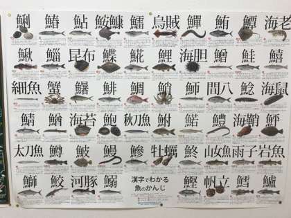 第一仮設校舎1階の配膳室前に貼ったポスターです。魚に関係する漢字です。いくつ読めますか?