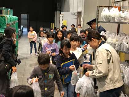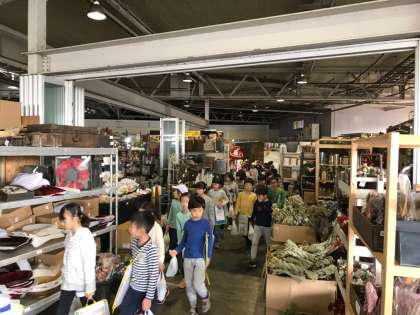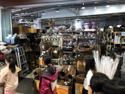 見学記念に、一人一株ずつお花をいただきました。花のディスプレイ用品などが売られているお店の前を通って移動しました。もうクリスマス、お正月関連の物が並んでいます。