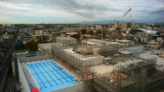 小川さんに校舎の工事現場の空撮写真をいただきましたので、お届けいたします。全貌が明らかになってきました。プールの青い床が目をひきます。