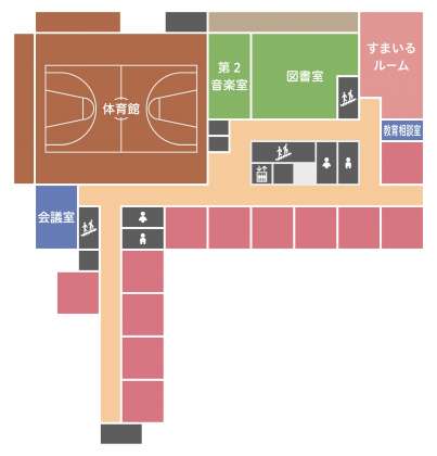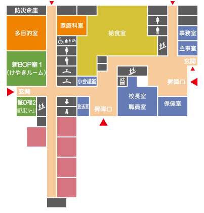 新校舎の案内板(サイン図)を入手しましたので、ご紹介します。濃いピンク色のところは普通教室です。どの階に何年生が入るかは、まだ決まっていません。