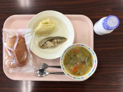 今日は、ダイスチーズパン、魚のハーブ焼き、マッシュポテト、田舎風豆スープ、牛乳です。
