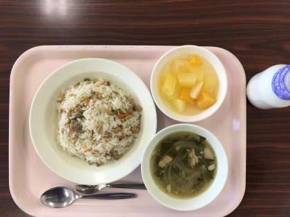 今日は、鶏とごぼうのピラフ、オニオンスープ、ミックスフルーツ、牛乳です。