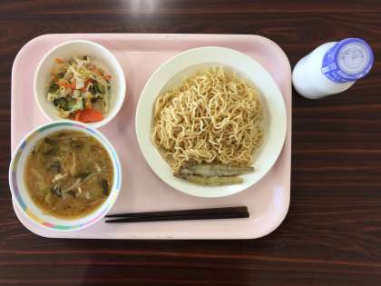今日は、つけみそラーメン、わかさぎのから揚げ、白菜の中華サラダ、牛乳です。