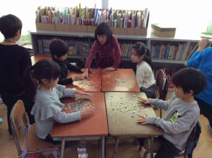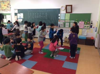 2年生が1年生に昔あそびを教えています。2年生は、12月に地域の方からたくさん昔あそびを教えていただきました。今日は先生役ですね。