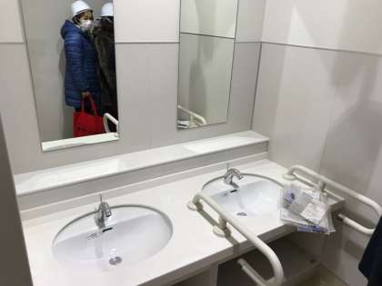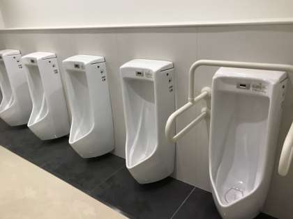 昨日のこれが新校舎だ!の続きです。男子トイレです。洗面台は自動水栓です。
