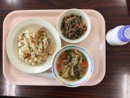今日は、かしわずし、のっぺい汁、小松菜サラダ、牛乳です。