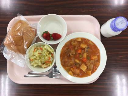 今日は、ダイスチーズパン、トマトシチュー、コールスロー、いちご、牛乳です。