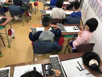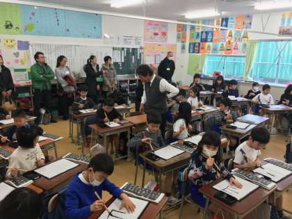 前・喜多見小学校長の中村敏先生に、日本語の授業で、書道を教えていただきました。初めて筆で字を書いた子どもたちは楽しそうに取り組んでいました。
