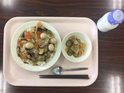 今日は、中華丼、きゅうりと大根のピリ辛和え、牛乳です。