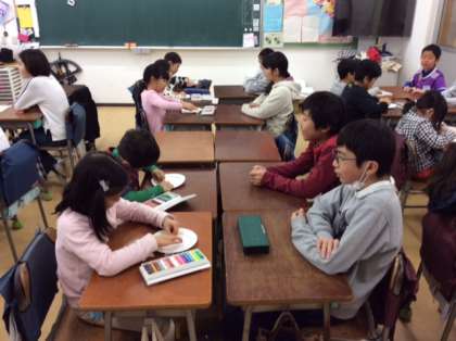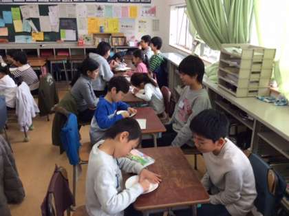 1年生がお世話になった6年生の似顔絵を描いています。心温まる光景です。
