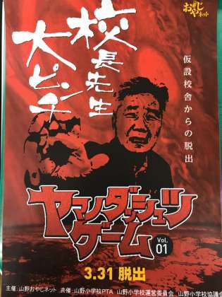山野小おやじネット渾身の新企画、ヤマノダッシュツゲームの告知ポスターが完成しました。イベントは3月31日土曜日です。詳細は近日配布のプリントをお読みください。
