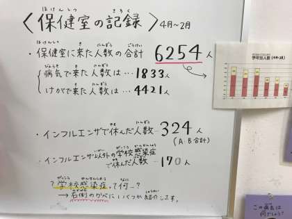 朝方まで激しい雨でした。写真は保健室前の掲示です。