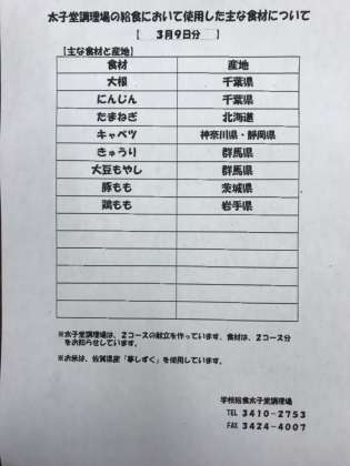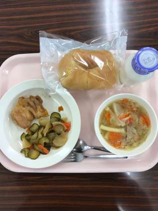献立は、大豆チーズパン、鶏肉のマーマレードソース、シャキシャキ野菜、マカロニスープ、牛乳です。今日は会食はお休みです。献立は、太子堂中と駒留中のリクエストで決まりました。私は、世田谷区立の某中学校に通っていましたが、確か中1の途中まではお弁当持参で、それ以降は太子堂調理場から運ばれた給食を食べていたことを覚えています。印象的だったのは、ステンレスの楕円形のランチ皿を使っていたことです。小1から始まった学校給食とのお付き合いも随分と長くなりました。