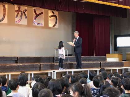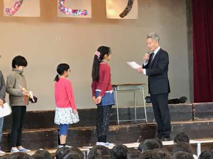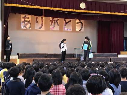 書き初めと絵画コンクールの表彰に続いて、持ち物は計画的に持ち帰ろうという、週目標のお話が寸劇でありました。