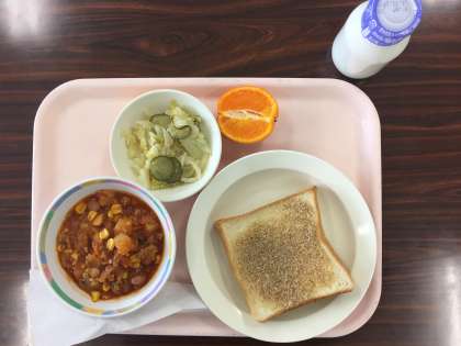 今日は、セサミトースト、チリコンカン、オニオンサラダ、ぽんかん、牛乳です。
