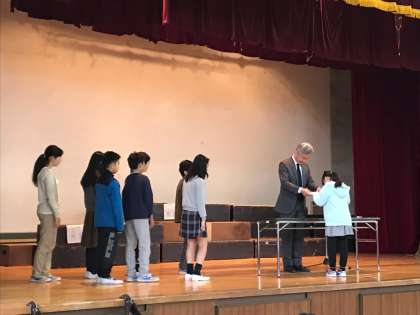 いよいよ平成29年度最後の日です。この体育館にみんなが集まるのも最後です。まずは、各学級の代表児童が修了証を受け取りました。校長先生からは、山野小学校を牽引してきた6年生へのエールと、後を受け継ぐ5年生への期待をこめたお話がありました。