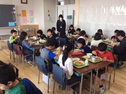 給食2日目の様子です。スパゲッティミートソースをもりもり食べています。