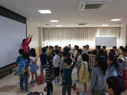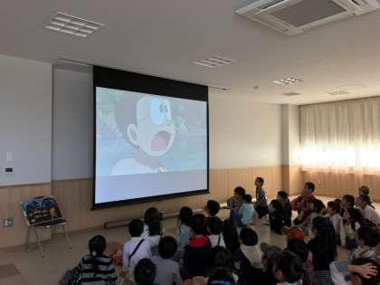 学校協議会の皆さまが、会議室で楽しいゲームやドラえもんの映画の上映をしてくださいました。