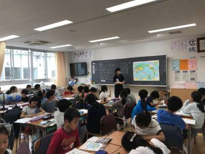世界地図を見ながら、大陸の名前と位置を確認しています。