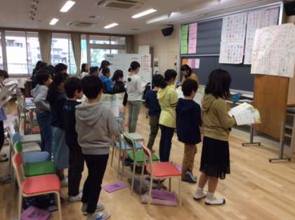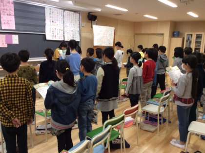 第二音楽室での授業です。きれいな歌声を響かせています。椅子がカラフルになりました。