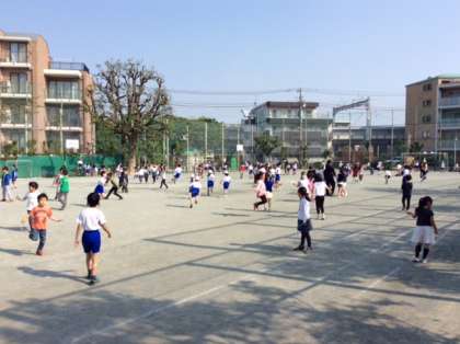 今朝は、1、2、3年生のロング朝あそびです。気持ちの良い天気です。