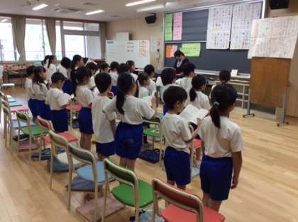 2年生と6年生の音楽の時間です。山野小の子どもたちは、歌が上手です。