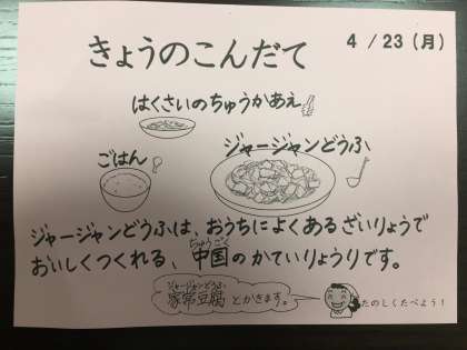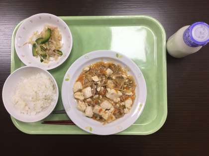 今日は中華です。メインの常家豆腐(ジャージャンどうふ)、本来は油で揚げた豆腐を使う料理のようですが、普通の豆腐です。自校給食の豆腐は、センター給食で使っている豆腐より美味しいです。