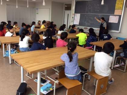 これからポスターを描きます。先生の説明に食い入るように聞き入っています。