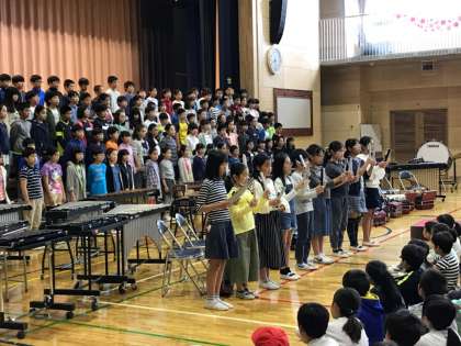 12日の式典に学校の代表として参加する6年生の歌と呼びかけ、合奏を聞きました。