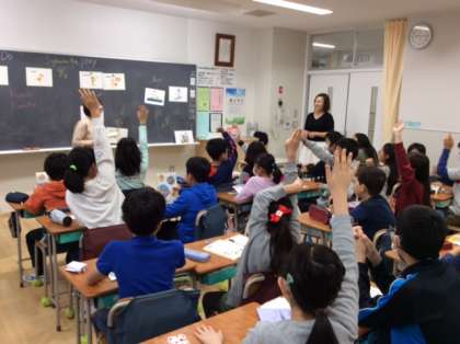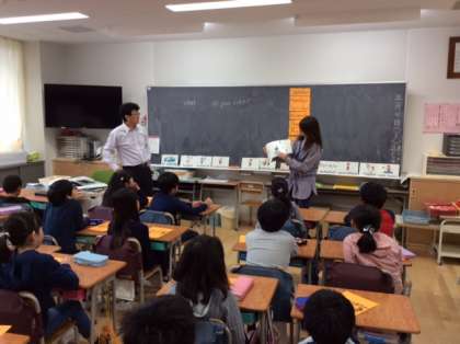 5、6年生の外国語では、担任と英語支援員の先生が、ティームティーチングで授業を進めています。