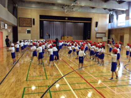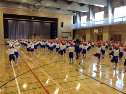 初めてのスポーツフェスタ。ダンシング玉入れの練習風景です。