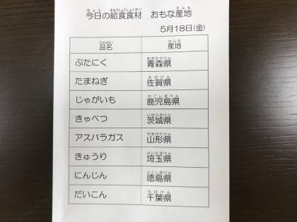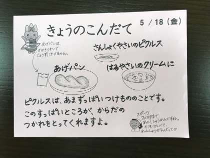 今日は学校給食の鉄板メニュー、揚げパンの登場です。スタンダードな白砂糖がかかっています。ウィキペディアによれば、「戦後の児童らの栄養状態を安価に引き上げるため、大田区立嶺町小学校で最初に開発された」とのことです。もしも嶺町小学校で「元祖揚げパン」とアピールしていたら楽しそうです。ピクルスの液は酸っぱさ控え目。でも暑い日にはありがたいです。今日の野菜の産地の中で、唯一行ったことがないのは鹿児島県です。吹奏楽で演奏したらよさそうなテーマ曲をもつ今回の大河ドラマの舞台に、いつか行ってみたいと思っています。