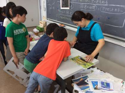 図工の時間です。山野小の子どもたちは、色の使い方がとても明るいですね。