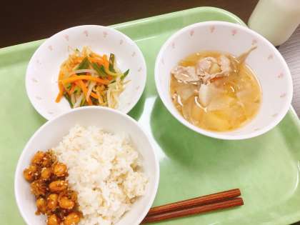 大豆とじゃこは噛み応えが十分で、噛めば噛むほど味が出ます。茎わかめも歯応えがあり、根菜のみそ汁は、ごぼうと豚肉が、噛み応えがありました。