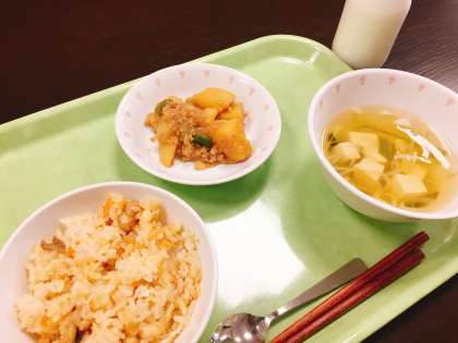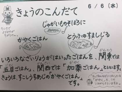 今日は和食、かやくご飯です。関東では、「五目ご飯」と呼ぶのが一般的ですが、関西風に薄味にしてるので、「かやくご飯」としたそうです。