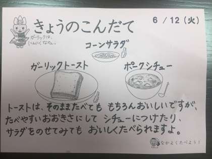 食べ終わってから、栄養士の先生が書いた「今日のこんだて」を見たら「シチューにつけたり、サラダをのせてみても」と書いてありました。