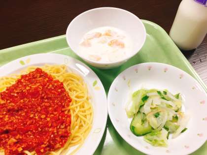 今日は、スパゲティミートソースです。この、ミートソースというのは和製英語で、このソースは「ボロネーゼ」、イタリア北部のボローニャ地方発祥のソースです。日本では、ナポリタンとミートソースが、スパゲティの双璧ですね。