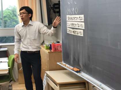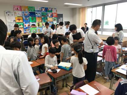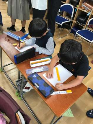 今年度の1回目の研究授業は2年生の算数です。長さの単元の1時間目。一人一枚、直線が書かれたカードが配られました。自分の身の回りの物を使って長さを測り、同じ長さの仲間を探します。