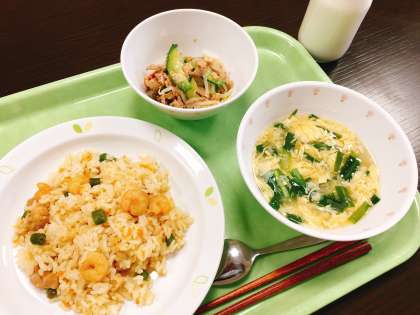 今日は、えびチャーハン、バター味のエビピラフじゃなくて、中華風のチャーハンです。「えび」は、平仮名表記かカタカタ表記か迷います。漢字があるから平仮名かな?