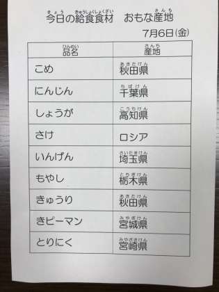 明日は七夕。それにちなんだ献立です。ちらしずしの上には星形ののりをかけます。また、すまし汁の中には星形のお麩と天の川に見立てたそうめんが入っています。「たなばたさま」の歌の歌詞にある「五色」のおひたしも登場しました。七夕づくしでうれしいです。七夕といえは、くすのきまさしげさんの絵本「おごだでませんように」を思い出します。よろしければ読んでみてください。図書室にもちゃんとあります。