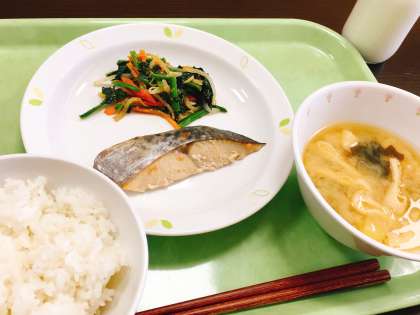 焼き魚、野菜のごまあえ、味噌汁、和食はバランスが良く美味しいですね。