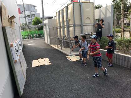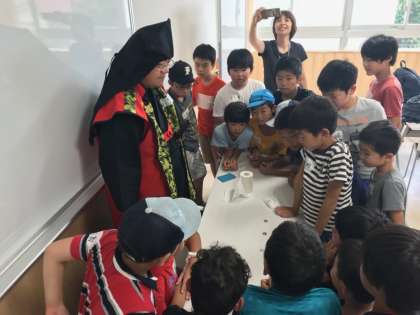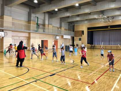 砧中学校の平田先生に、忍法と剣術、手裏剣の投げ方を教えていただきました。平田先生は忍者の服装で完全になり切っています。
