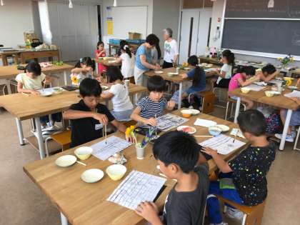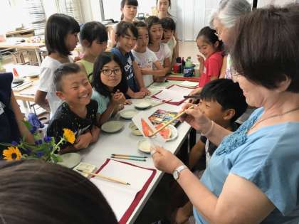 暑中お見舞いのはがきを描いてみよう。筆の上を持って、はみ出るぐらい大きく描くのがポイントだそうです。