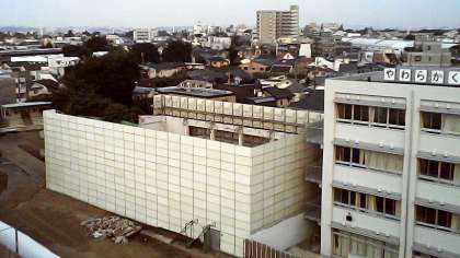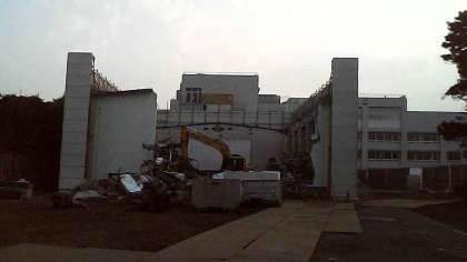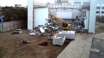 8月の撮影担当は大井さんです。体育館の内側は解体が進み、外壁だけが残っています。