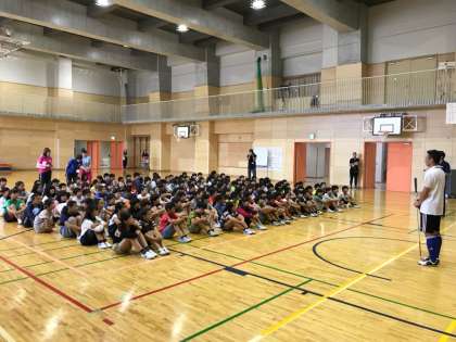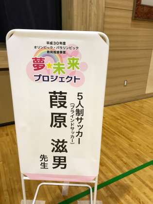 オリンピック・パラリンピック教育の一環として、パラリンピックの陸上・自転車競技のメダリスト、葭原(よしはら)滋男さんをお招きしました。葭原さんは病気で全盲になりましたが、体を動かしてみようと思い、さまさまなスポーツに挑戦することにしたのだそうです。
