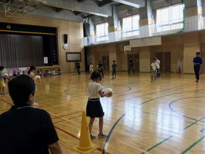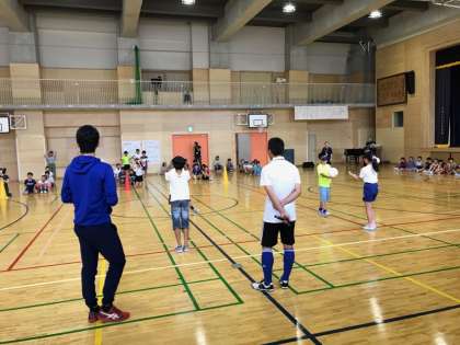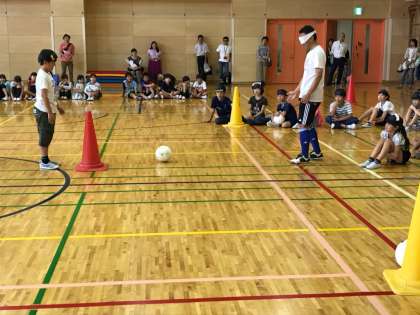 後半は代表児童によるブラインドサッカー体験です。鈴が中に入った特別なボールを使い、アイマスクをしてプレーします。声や音を出して周囲の様子を把握して、ボールを蹴るのですが、なかなか難しいです。