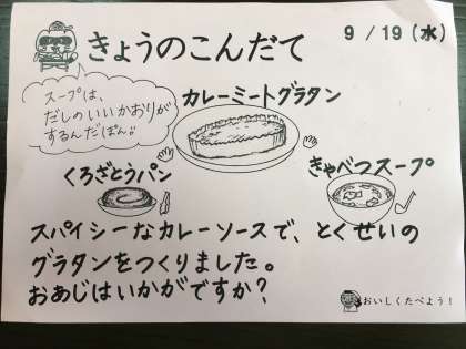 今日のメインは、カレーミートグラタンです。グラタンのパスタはペンネを使っていて、とてもおしゃれな感じです。口に入れると、カレーのスパイスの香りが広がります。