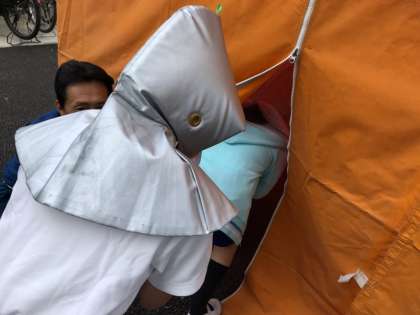 3、4年は煙体験をしました。テントの壁を触って、姿勢を低くして進みます。