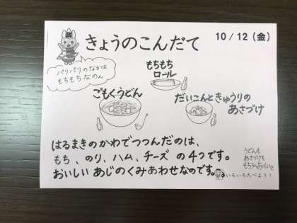 今日は久しぶりにうどんの出番です。昨日、たまたまテレビを観ていたら、讃岐うどんの特集をやっていました。私は、まだ現地で食べたことがないので、一度は本場の讃岐うどんにチャレンジしたいと思っています。「もちもちロール」は、おもちとのり、ハム、チーズを春巻きの皮で包んであげたものです。ある学年の子が「皮が口に当たっていたい」と言っていたそうです。そうか・・・、どうしたらよいか考えますね。