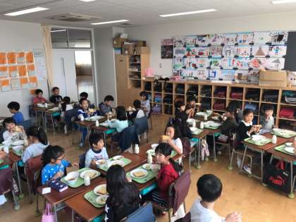 1年生の教室に給食補教に行きました。食事中の一コマです。